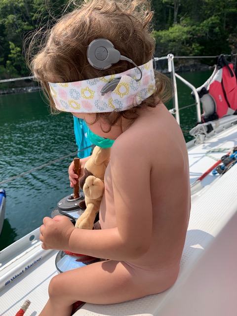 June has two activated, programmed, working cochlear implants! Her right side was activated a few weeks ago and she is responding well to both implants. While Jonah was participating in an adventure/service project in Hawaii, Chris, June, and I sailed around Mount Desert Island region of Maine in our 31 foot sailboat Ranger. June was quite the crew member, she did amazing! We managed to keep her helper ears dry and in good working condition while living on the boat and sailing to some super cool spots. Check out some pics of the newest Ranger crew member!