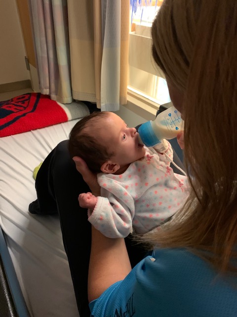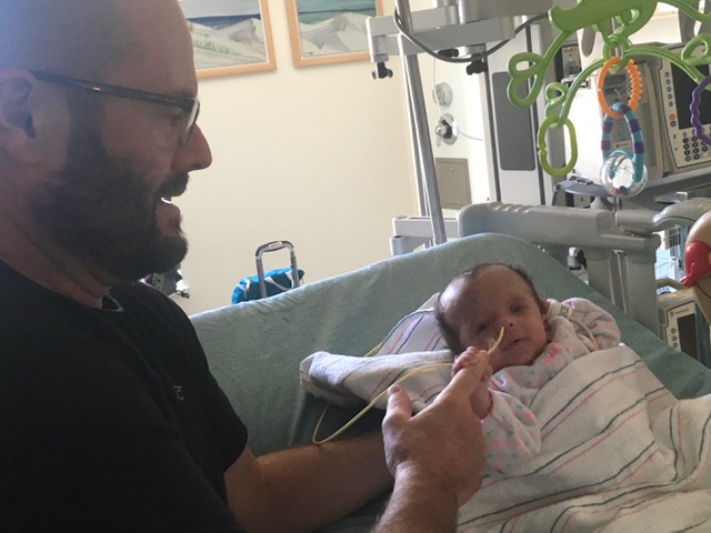 Monday afternoon right before her gigantic feeding tube came out. June loves playing hand squeezing games with Dad! No tubes from the nose, in comfy PJ’s, and drinking from a bottle…life is good!